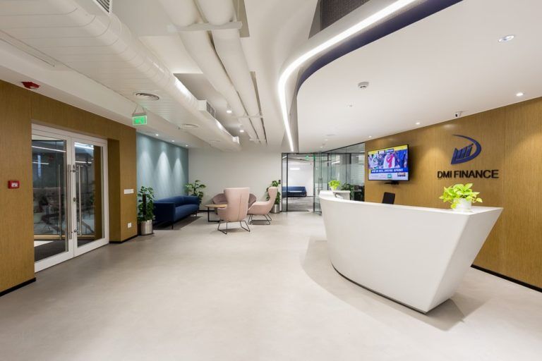 The details make a fine statement across the entire office spread. Moving in congruence with the vertically designed masses, the interiors incorporate continuity and harmony. The use of greens inside the office quotes the environment effortlessly. The office of DMI designed by SKV escapes the conventional and traditional path of visualizing a workspace. Rather, it intensifies modern proficiency by creating a free-flow working environment with the help of glass partitions and hot-desking in a variety of designer furniture.