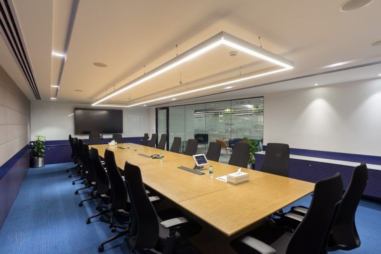 The conference room is nestled on the other side of the reception. The vertically aligned space is designed with a dash of impeccability to provide a focused environment for team meetings. The monotonous theme of whites and greys takes a break below the eye level where the tinge of navy blues makes the space highly aesthetic.