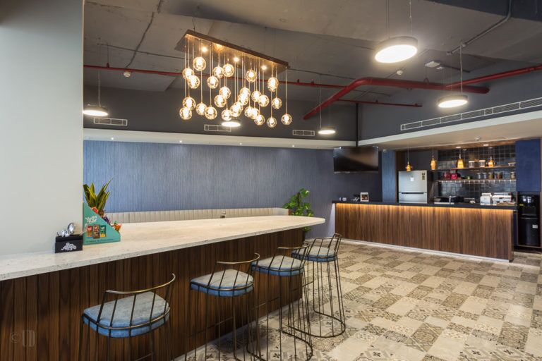 Tables are arranged independently that reflect both professionalism and provide their workforce with comfortable, collaborative workspaces. The stylish and elegant seatings near the glass facade set the tone of the space in a true laidback style where one can take a break and enjoy the outdoors in the vicinity.