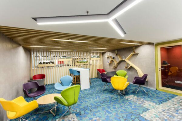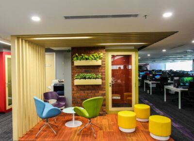 Well-lit booths with stylish and unique furniture, this space is built to engage and encourage employees at all levels of productivity and ideation. The space has different sections with each section displaying a different characteristic from playful to somber. This workspace is an amalgamation of youthful as well as monochromatic with indoor plants providing depth and life to the work stations.